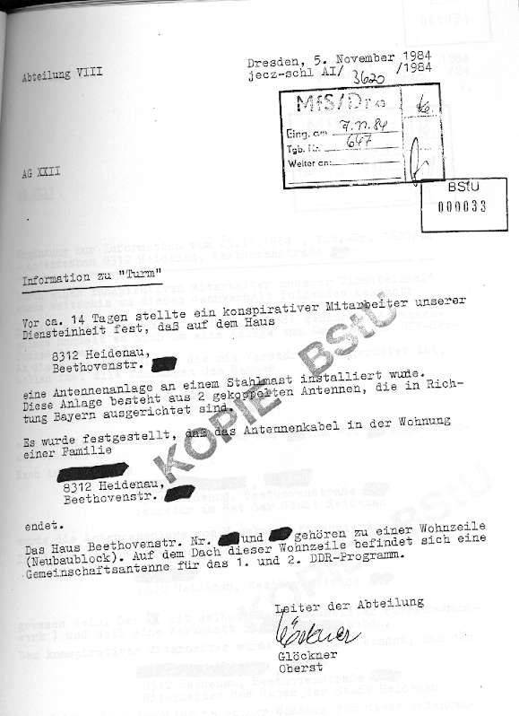 Eine Rahmenhandlung des Films bietet der Operative Vorgang "Turm": Mitte der achtziger Jahre gingen anonyme Briefe ein, in denen mit der Sprengung des Dresdener Fernsehturms und anderer öffentlicher Einrichtungen gedroht wurde, wenn nicht der Empfang von mindestens drei West-Programmen ermöglicht wird. Das löste bei der Stasi ein penible Überwachung der gesamten Antennen- und Kabelnetzszene aus.